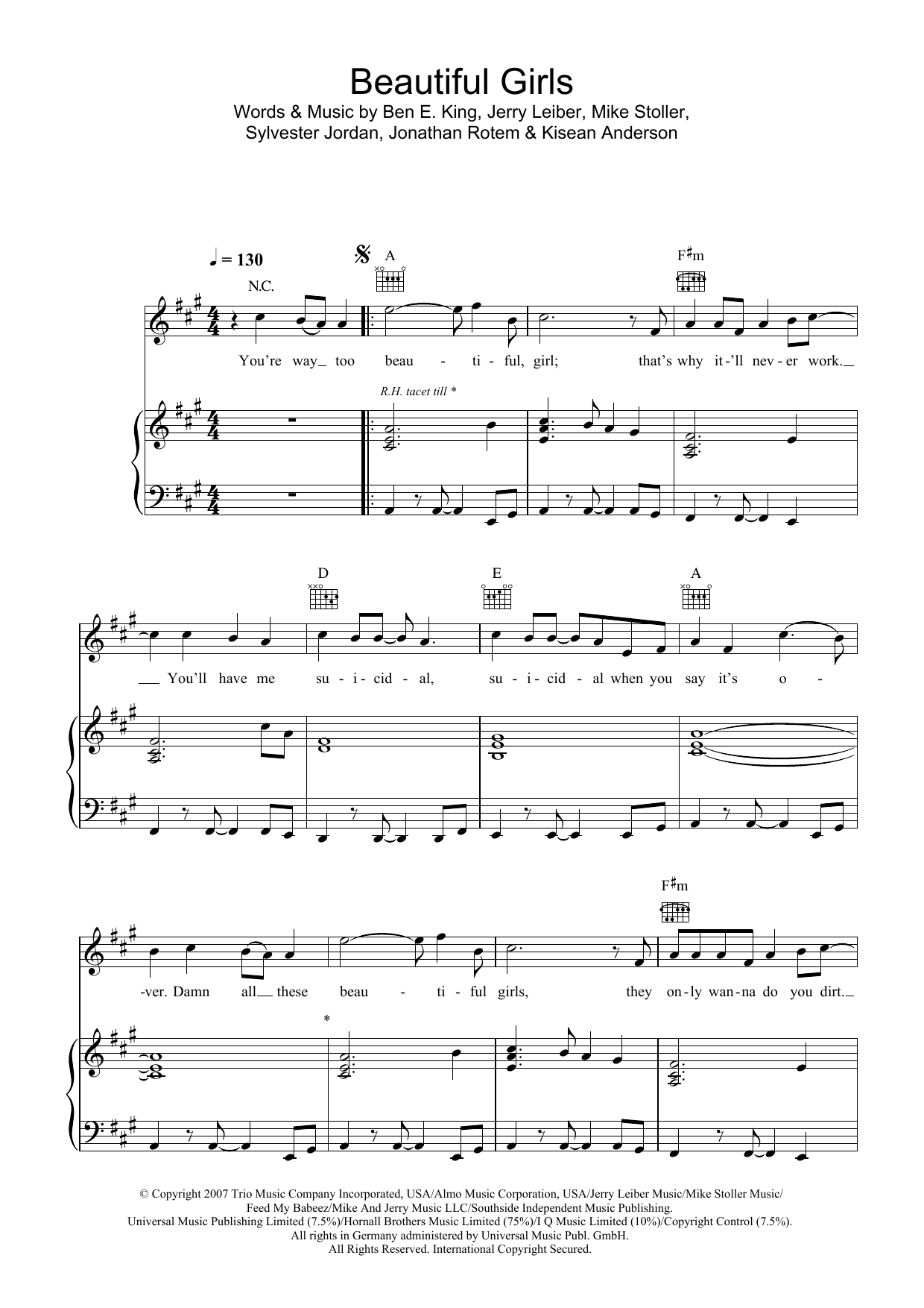 Download or print Sean Kingston Beautiful Girls sheet music, chords and digital score arranged for Piano, Vocal & Guitar Chords (Right-Hand Melody). This Pop score includes 4 page(s).