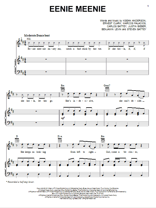 Download or print Sean Kingston & Justin Bieber Eenie Meenie sheet music, chords and digital score arranged for Really Easy Piano. This Pop score includes 2 page(s).