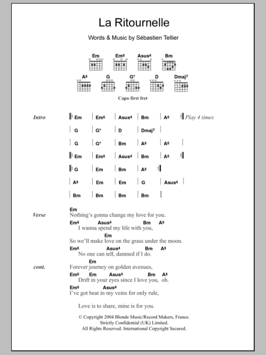 Download or print Sébastien Tellier La Ritournelle sheet music, chords and digital score arranged for Guitar Chords/Lyrics. This Pop score includes 2 page(s).