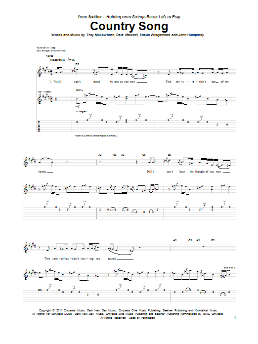 Download or print Seether Country Song sheet music, chords and digital score arranged for Guitar Tab. This Country score includes 9 page(s).