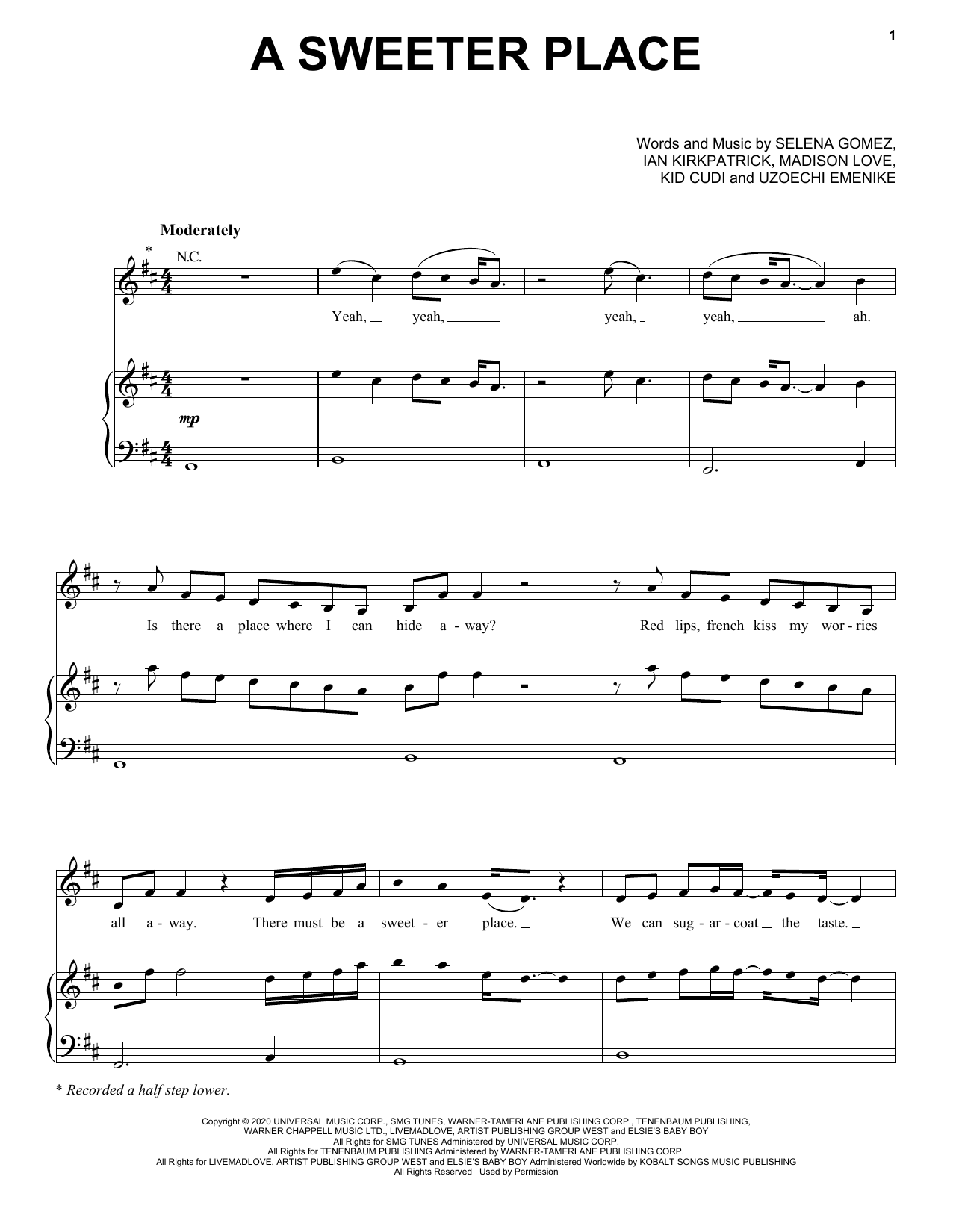 Download or print Selena Gomez A Sweeter Place (feat. Kid Cudi) sheet music, chords and digital score arranged for Piano, Vocal & Guitar Chords (Right-Hand Melody). This Pop score includes 7 page(s).