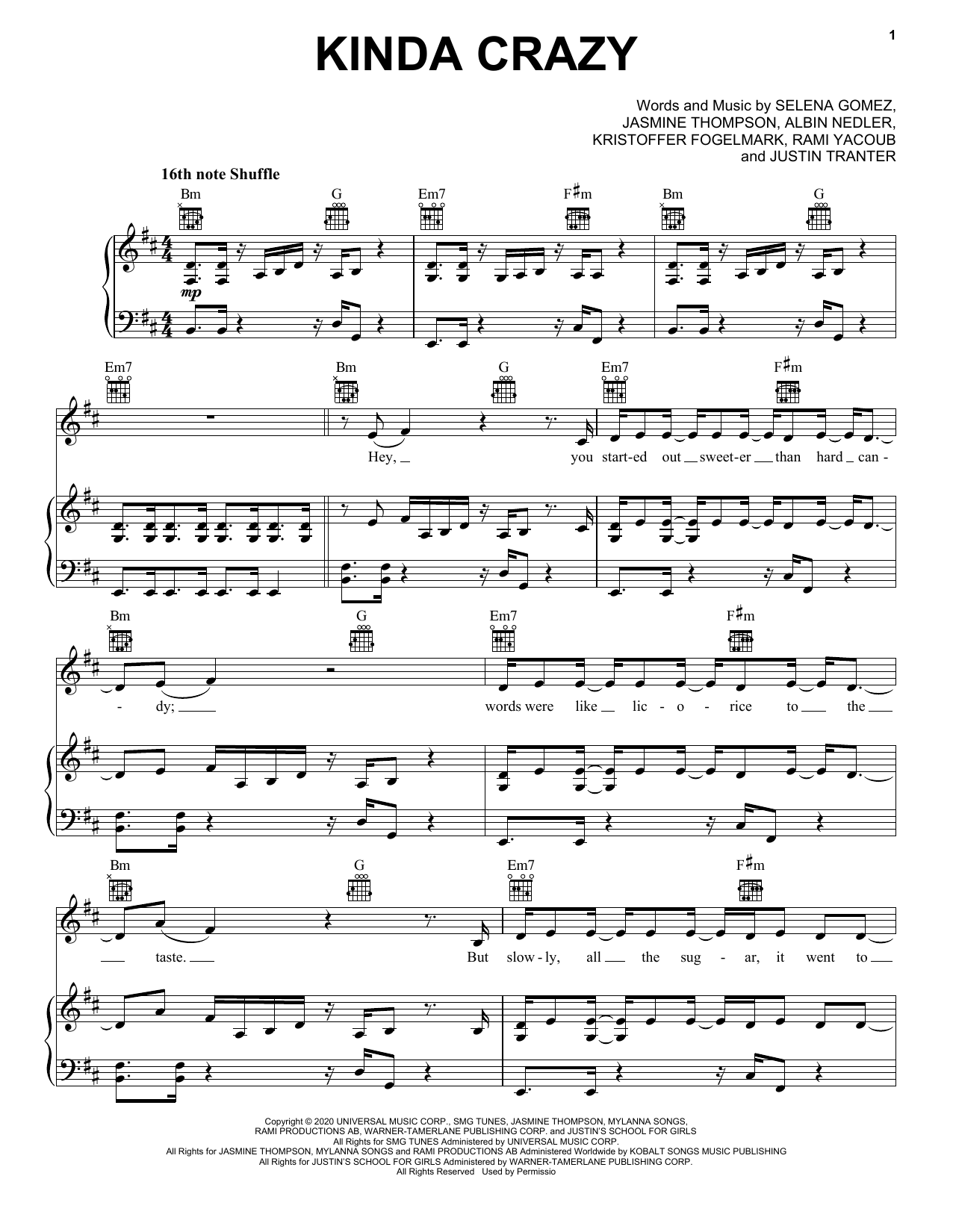 Download or print Selena Gomez Kinda Crazy sheet music, chords and digital score arranged for Piano, Vocal & Guitar Chords (Right-Hand Melody). This Pop score includes 7 page(s).