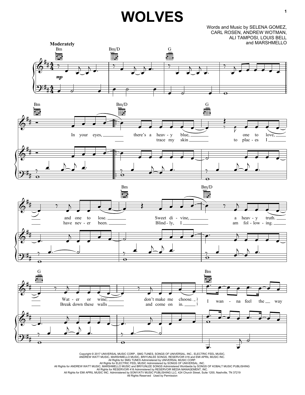 Download or print Selena Gomez & Marshmello Wolves sheet music, chords and digital score arranged for Piano, Vocal & Guitar Chords (Right-Hand Melody). This Pop score includes 5 page(s).