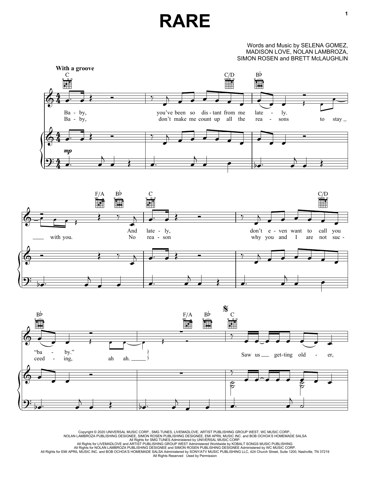 Download or print Selena Gomez Rare sheet music, chords and digital score arranged for Piano, Vocal & Guitar Chords (Right-Hand Melody). This Pop score includes 5 page(s).
