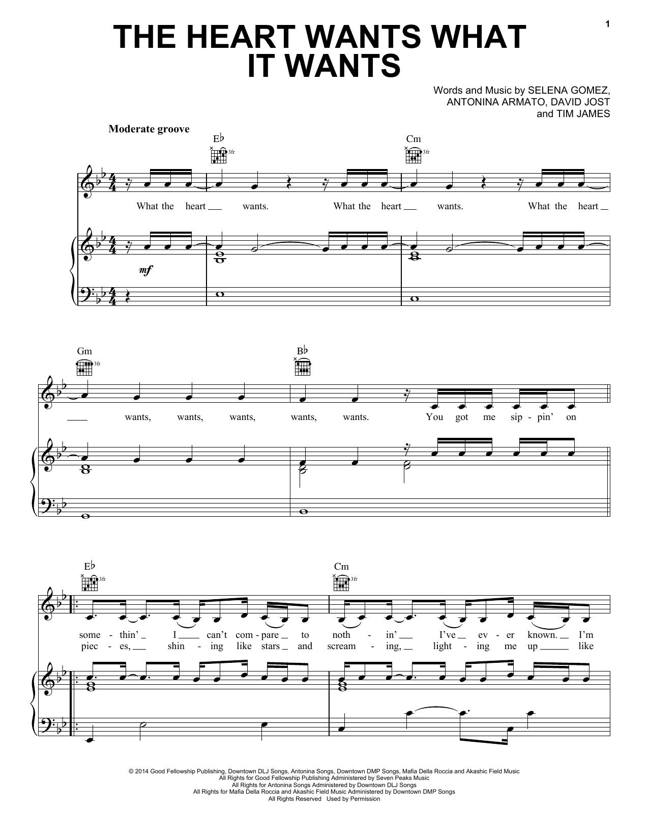 Download or print Selena Gomez The Heart Wants What It Wants sheet music, chords and digital score arranged for Piano, Vocal & Guitar Chords (Right-Hand Melody). This Pop score includes 5 page(s).