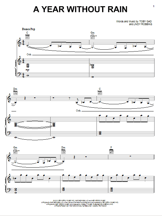 Download or print Selena Gomez & The Scene A Year Without Rain sheet music, chords and digital score arranged for Piano, Vocal & Guitar Chords (Right-Hand Melody). This Pop score includes 7 page(s).