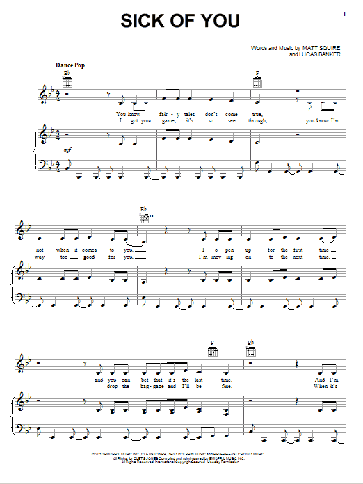 Download or print Selena Gomez & The Scene Sick Of You sheet music, chords and digital score arranged for Piano, Vocal & Guitar Chords (Right-Hand Melody). This Pop score includes 6 page(s).