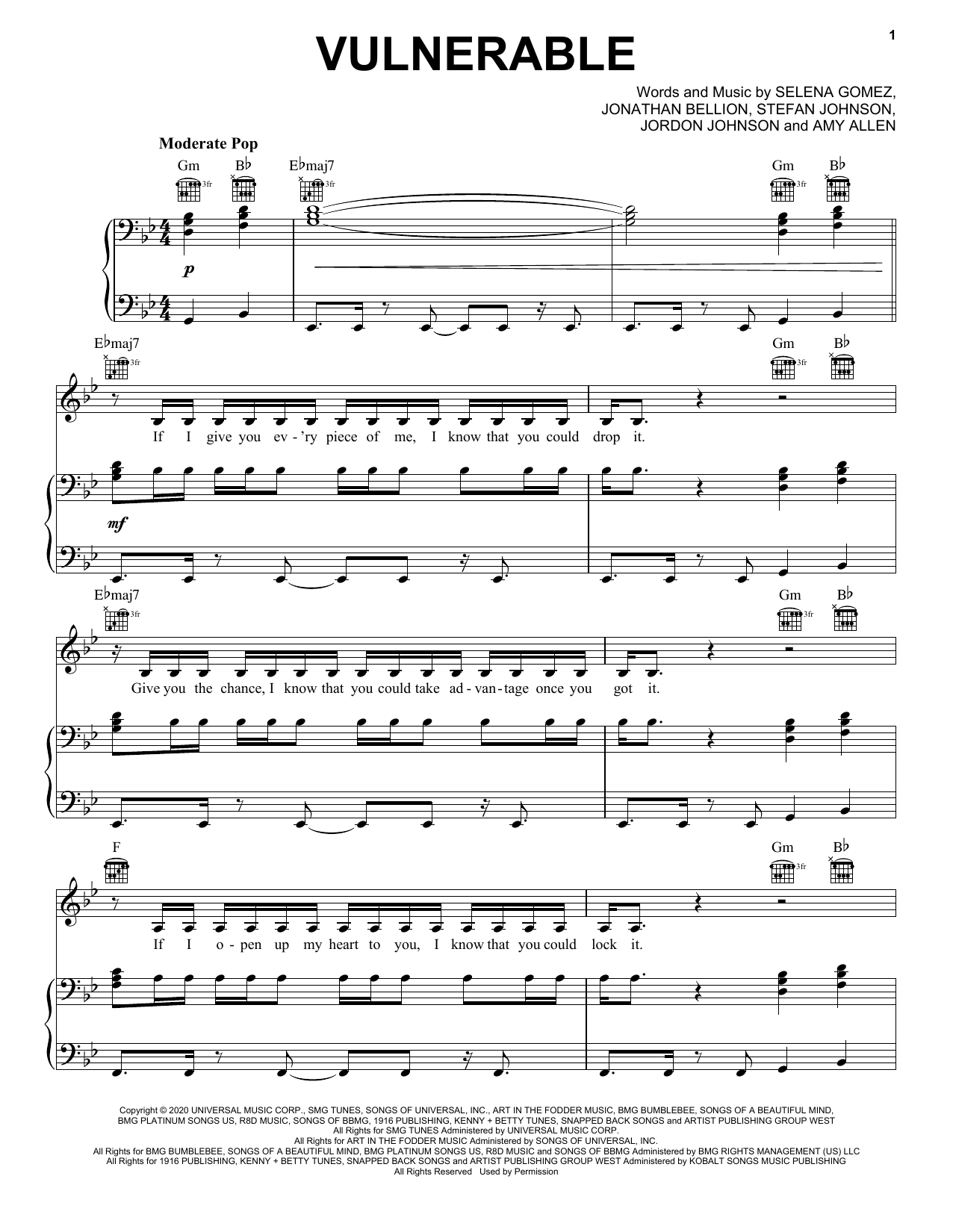 Download or print Selena Gomez Vulnerable sheet music, chords and digital score arranged for Piano, Vocal & Guitar Chords (Right-Hand Melody). This Pop score includes 7 page(s).