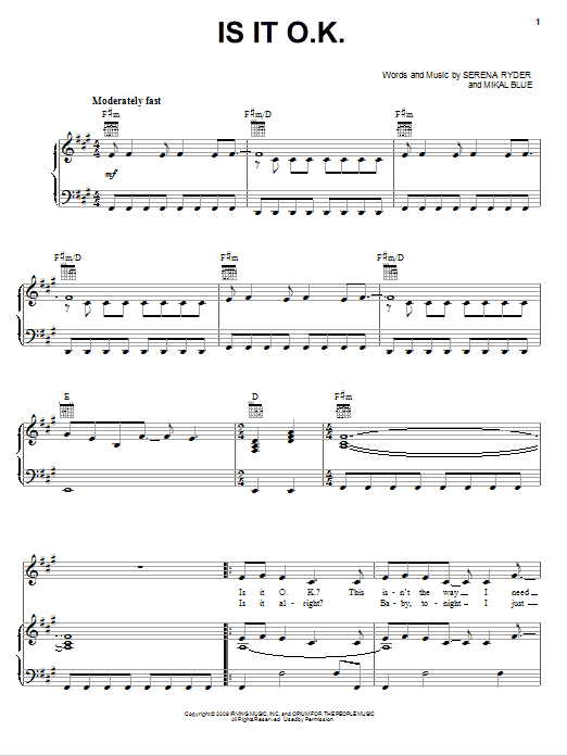 Download or print Serena Ryder Is It O.K. sheet music, chords and digital score arranged for Piano, Vocal & Guitar Chords (Right-Hand Melody). This Pop score includes 7 page(s).
