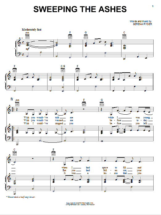 Download or print Serena Ryder Sweeping The Ashes sheet music, chords and digital score arranged for Piano, Vocal & Guitar Chords (Right-Hand Melody). This Pop score includes 8 page(s).