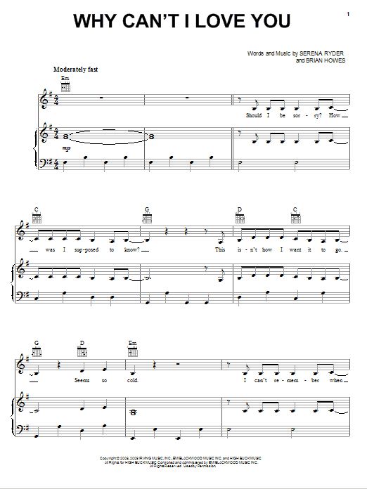 Download or print Serena Ryder Why Can't I Love You sheet music, chords and digital score arranged for Piano, Vocal & Guitar Chords (Right-Hand Melody). This Pop score includes 9 page(s).