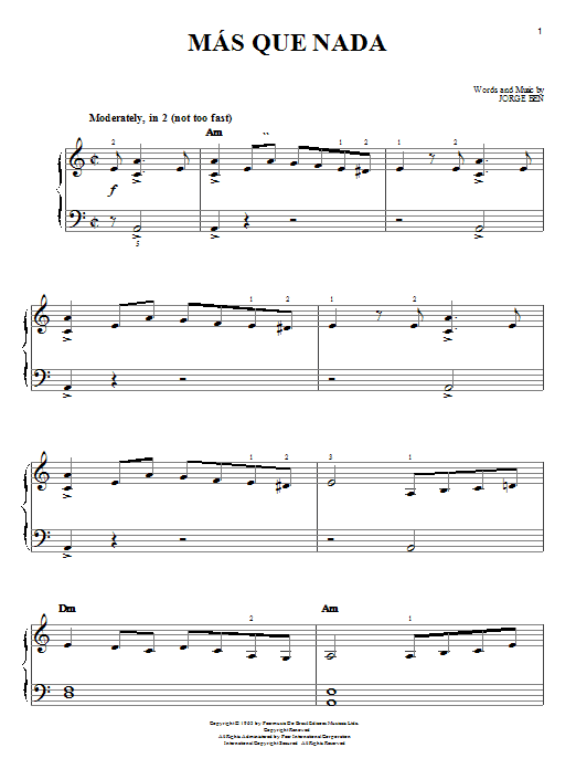 Download or print Sergio Mendes Mas Que Nada sheet music, chords and digital score arranged for Piano, Vocal & Guitar Chords (Right-Hand Melody). This Jazz score includes 4 page(s).