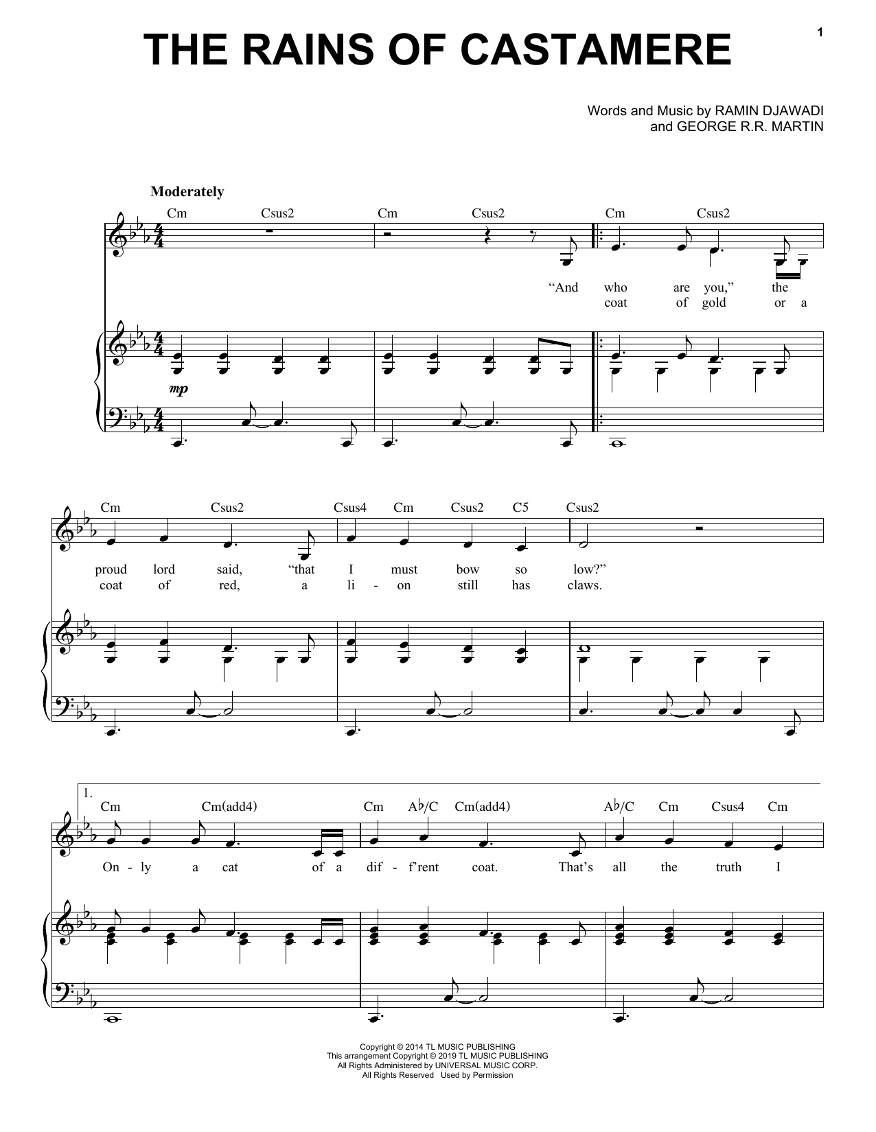 Download or print Serj Tankian The Rains Of Castamere (from Game of Thrones) sheet music, chords and digital score arranged for Piano, Vocal & Guitar Chords (Right-Hand Melody). This Film/TV score includes 5 page(s).