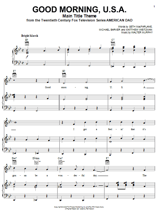 Download or print Michael Barker American Dad - Main Title Theme (Good Morning U.S.A.) sheet music, chords and digital score arranged for Piano, Vocal & Guitar Chords (Right-Hand Melody). This Film/TV score includes 3 page(s).