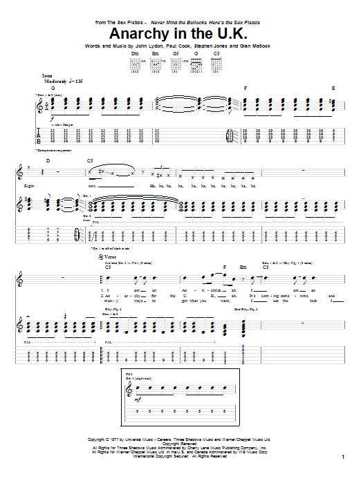Download or print Sex Pistols Anarchy In The U.K. sheet music, chords and digital score arranged for Piano, Vocal & Guitar Chords (Right-Hand Melody). This Rock score includes 6 page(s).
