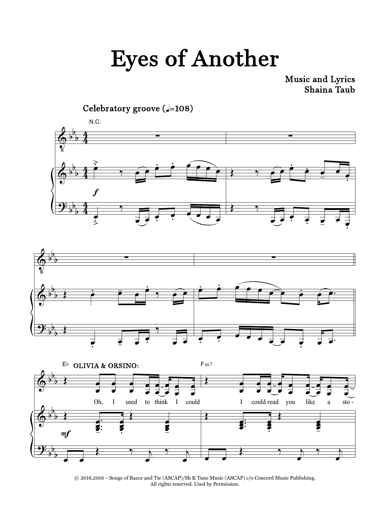 Download or print Shaina Taub Eyes Of Another (from Twelfth Night) sheet music, chords and digital score arranged for Piano & Vocal. This Musical/Show score includes 10 page(s).