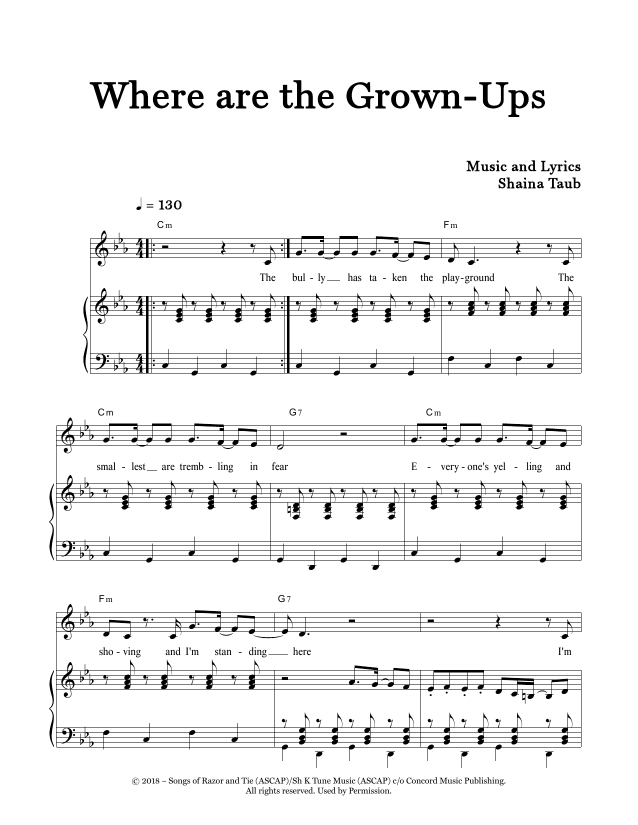 Download or print Shaina Taub Where Are The Grown-Ups sheet music, chords and digital score arranged for Piano & Vocal. This Folk score includes 8 page(s).