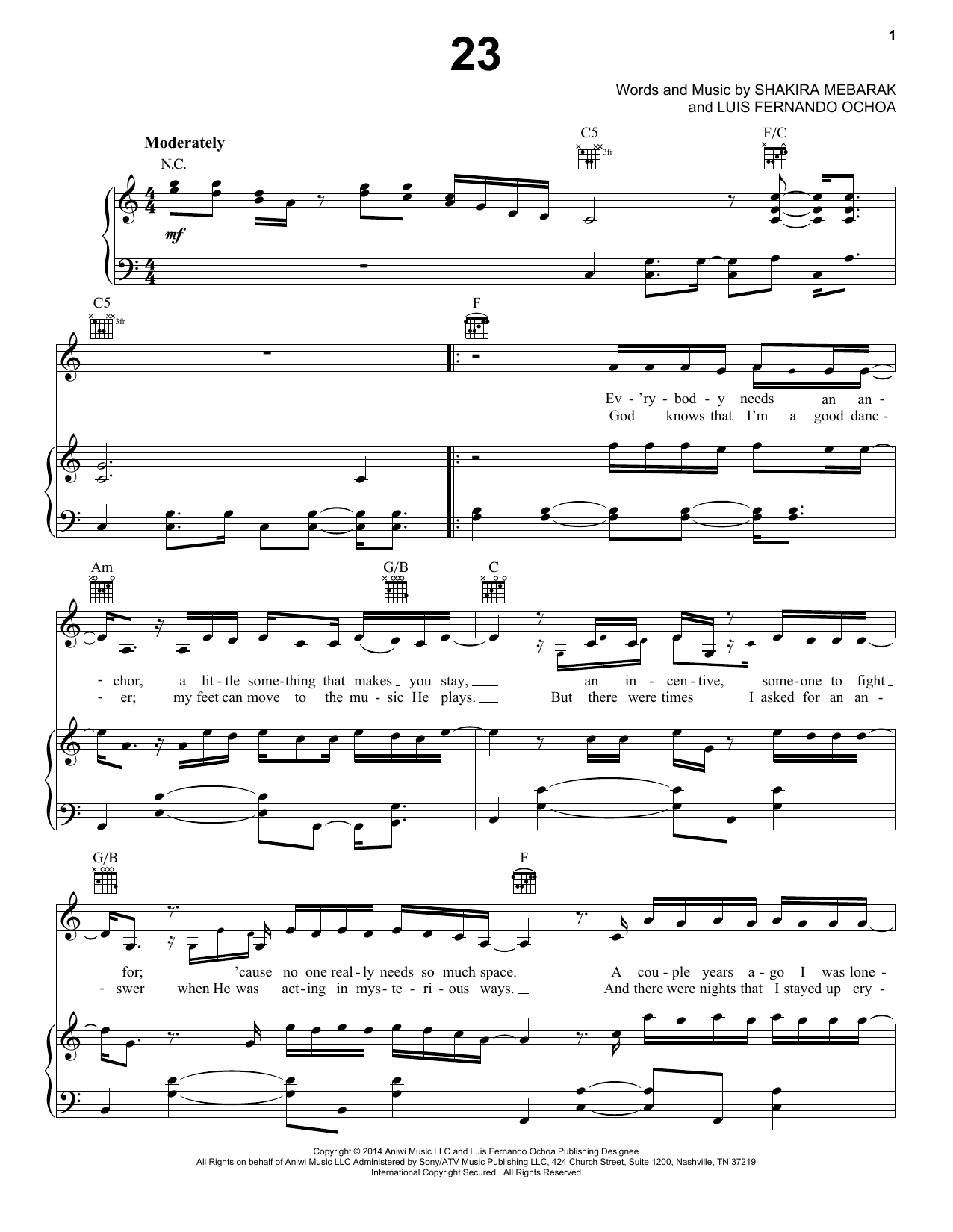 Download or print Shakira 23 sheet music, chords and digital score arranged for Piano, Vocal & Guitar Chords (Right-Hand Melody). This Pop score includes 6 page(s).