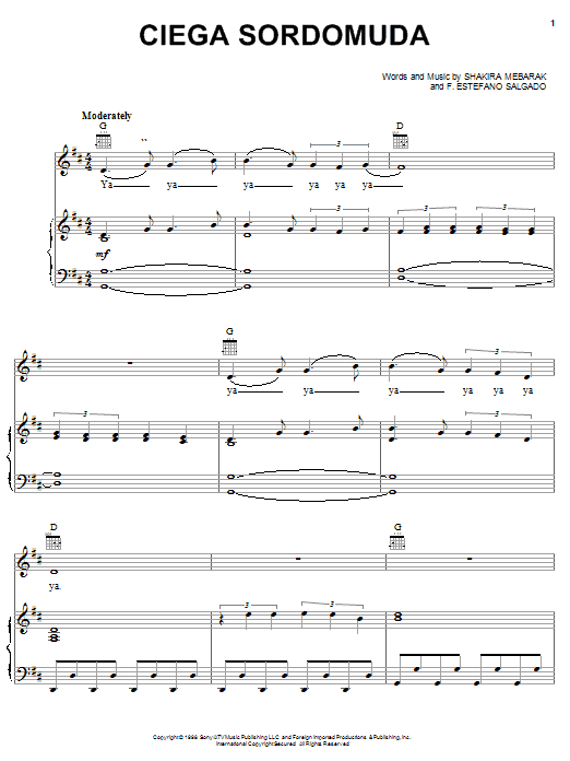 Download or print Shakira Ciega Sordomuda sheet music, chords and digital score arranged for Piano, Vocal & Guitar Chords (Right-Hand Melody). This Latin score includes 8 page(s).