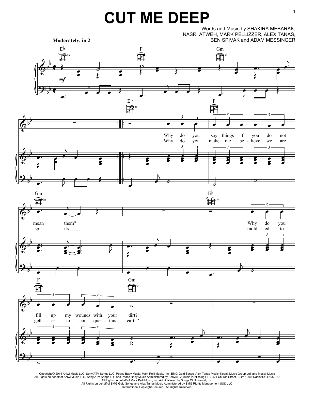 Download or print Shakira Cut Me Deep sheet music, chords and digital score arranged for Piano, Vocal & Guitar Chords (Right-Hand Melody). This Latin score includes 8 page(s).