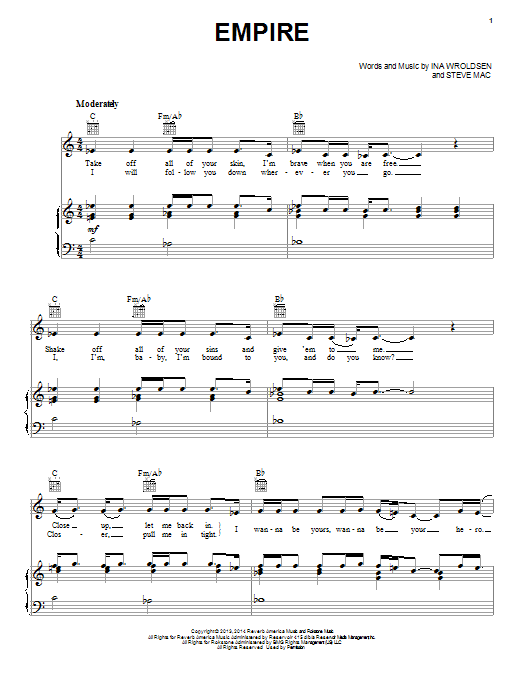 Download or print Shakira Empire sheet music, chords and digital score arranged for Piano, Vocal & Guitar Chords (Right-Hand Melody). This Pop score includes 6 page(s).
