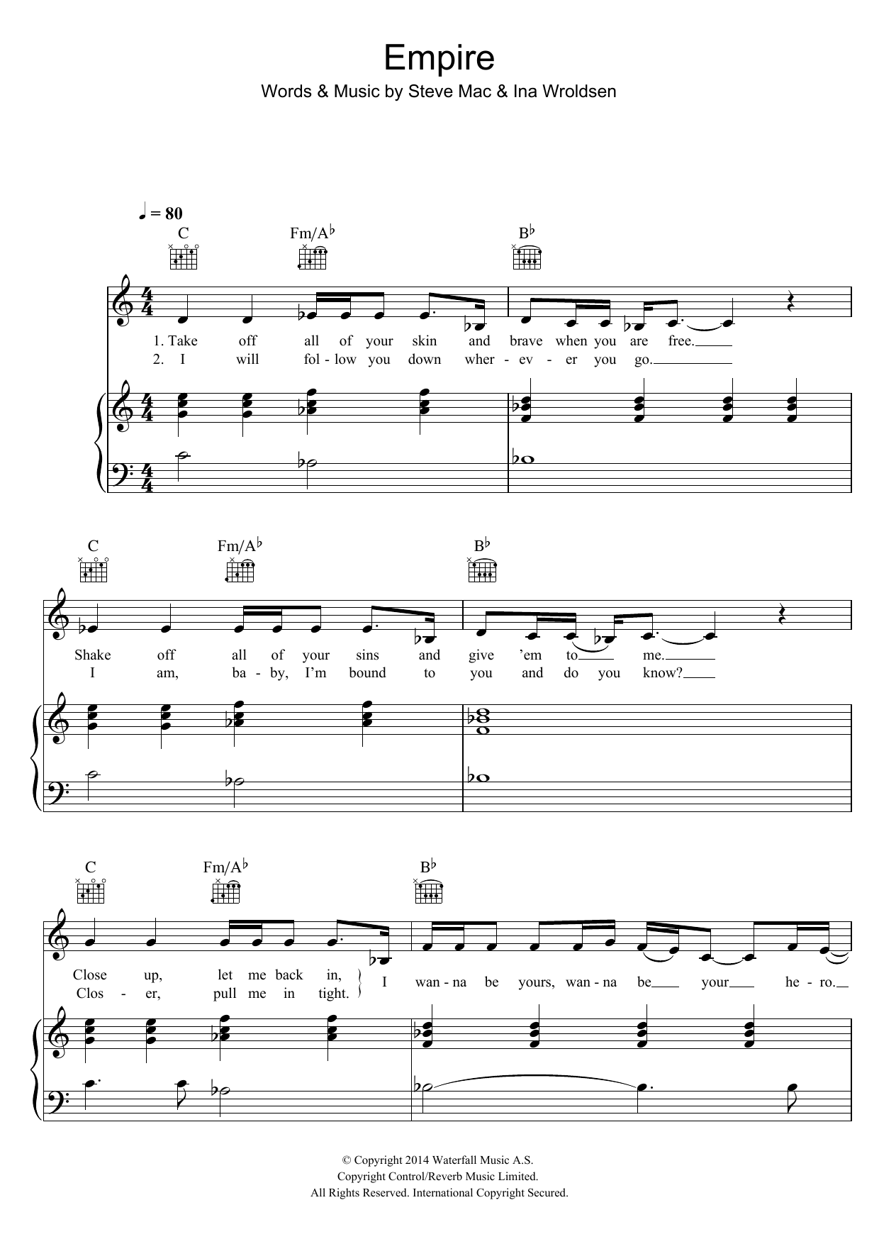 Download or print Shakira Empire (featuring Rihanna) sheet music, chords and digital score arranged for Piano, Vocal & Guitar Chords. This Reggae score includes 5 page(s).
