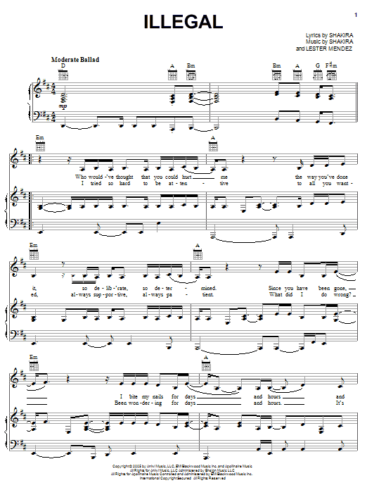 Download or print Shakira Illegal sheet music, chords and digital score arranged for Piano, Vocal & Guitar Chords (Right-Hand Melody). This Pop score includes 5 page(s).