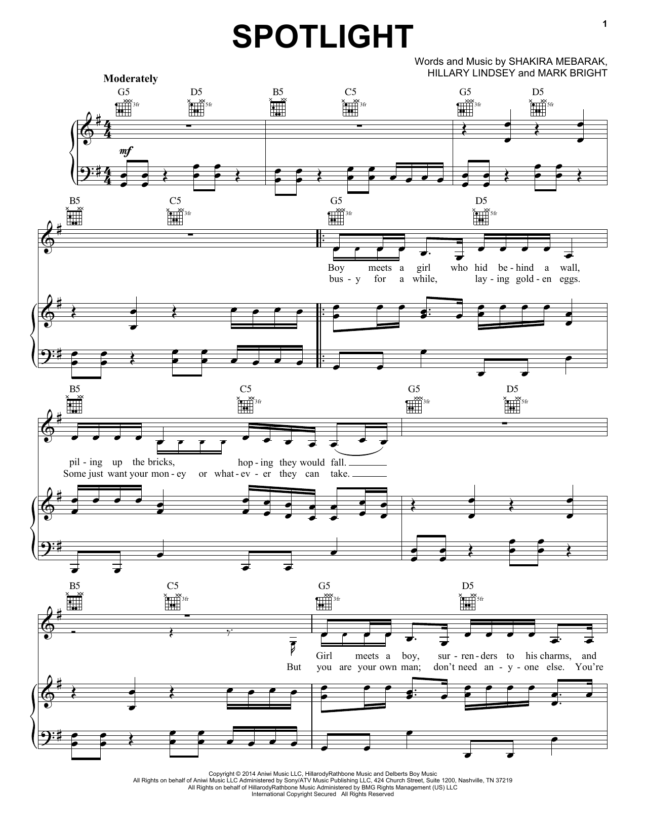 Download or print Shakira Spotlight sheet music, chords and digital score arranged for Piano, Vocal & Guitar Chords (Right-Hand Melody). This Pop score includes 5 page(s).