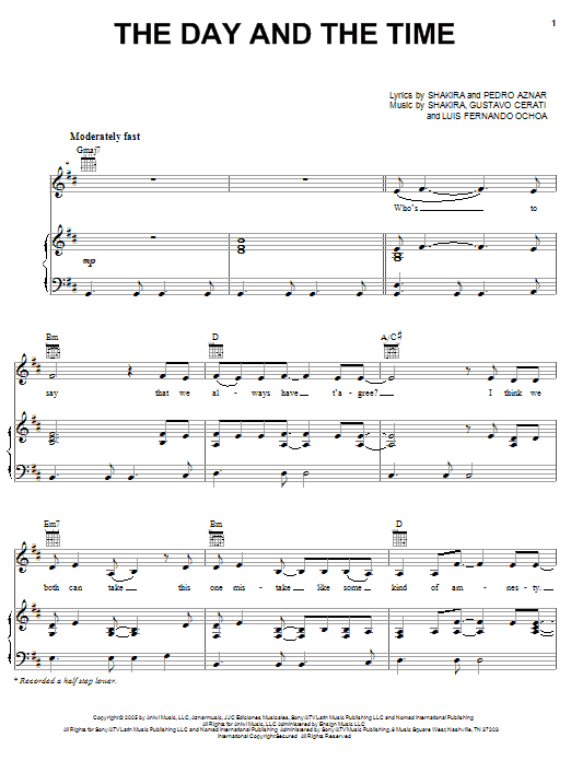 Download or print Shakira The Day And The Time sheet music, chords and digital score arranged for Piano, Vocal & Guitar Chords (Right-Hand Melody). This Pop score includes 7 page(s).