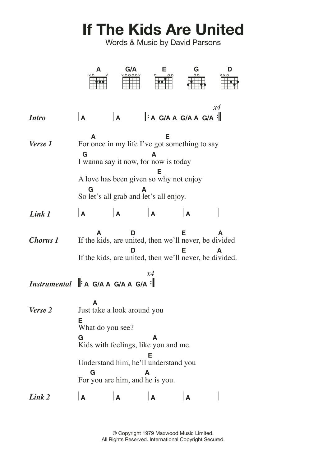 Download or print Sham 69 If The Kids Are United sheet music, chords and digital score arranged for Guitar Chords/Lyrics. This Punk score includes 3 page(s).