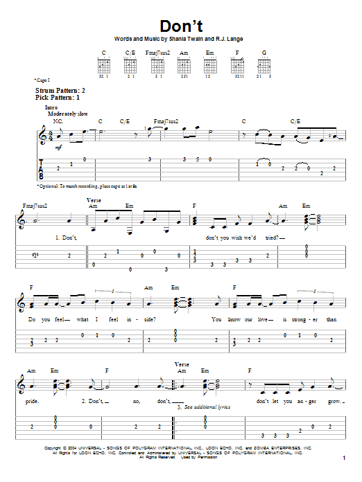 Download or print Shania Twain Don't! sheet music, chords and digital score arranged for Easy Guitar Tab. This Country score includes 4 page(s).