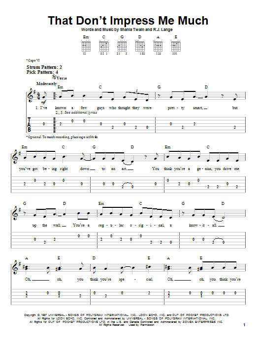 Download or print Shania Twain That Don't Impress Me Much sheet music, chords and digital score arranged for Lead Sheet / Fake Book. This Pop score includes 4 page(s).