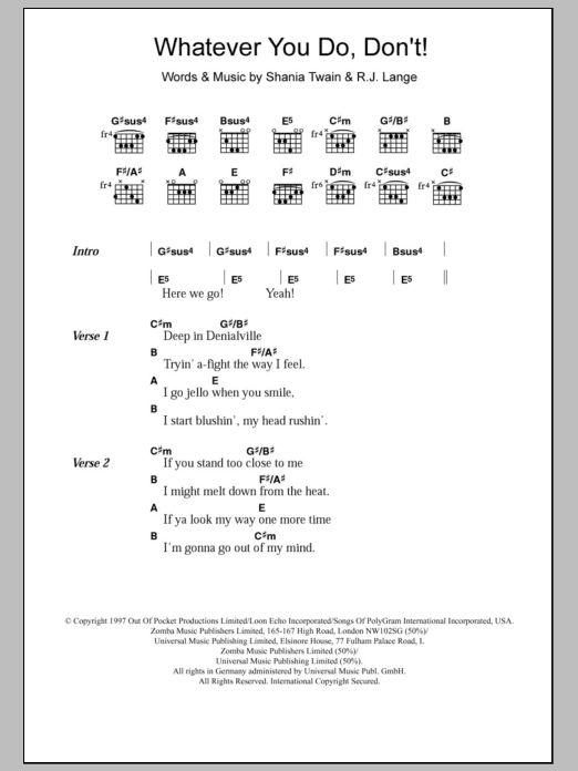 Download or print Shania Twain Whatever You Do, Don't! sheet music, chords and digital score arranged for Guitar Chords/Lyrics. This Pop score includes 3 page(s).