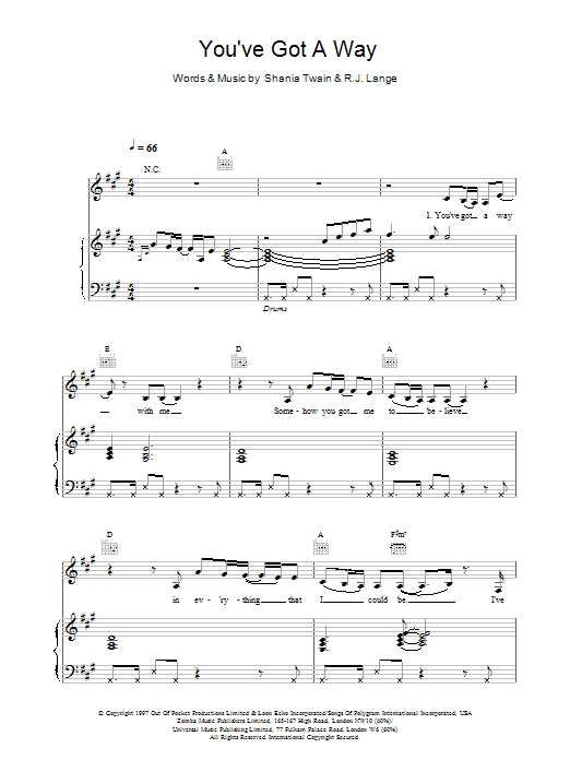Download or print Shania Twain You've Got A Way sheet music, chords and digital score arranged for Piano Chords/Lyrics. This Country score includes 2 page(s).