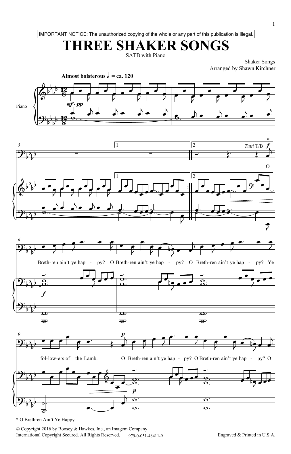 Download or print Shawn Kirchner Three Shaker Songs sheet music, chords and digital score arranged for SATB Choir. This Concert score includes 14 page(s).