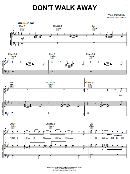 Download or print Shawn McDonald Don't Walk Away sheet music, chords and digital score arranged for Piano, Vocal & Guitar Chords (Right-Hand Melody). This Christian score includes 8 page(s).