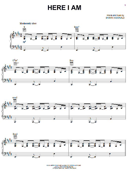 Download or print Shawn McDonald Here I Am sheet music, chords and digital score arranged for Piano, Vocal & Guitar Chords (Right-Hand Melody). This Christian score includes 7 page(s).