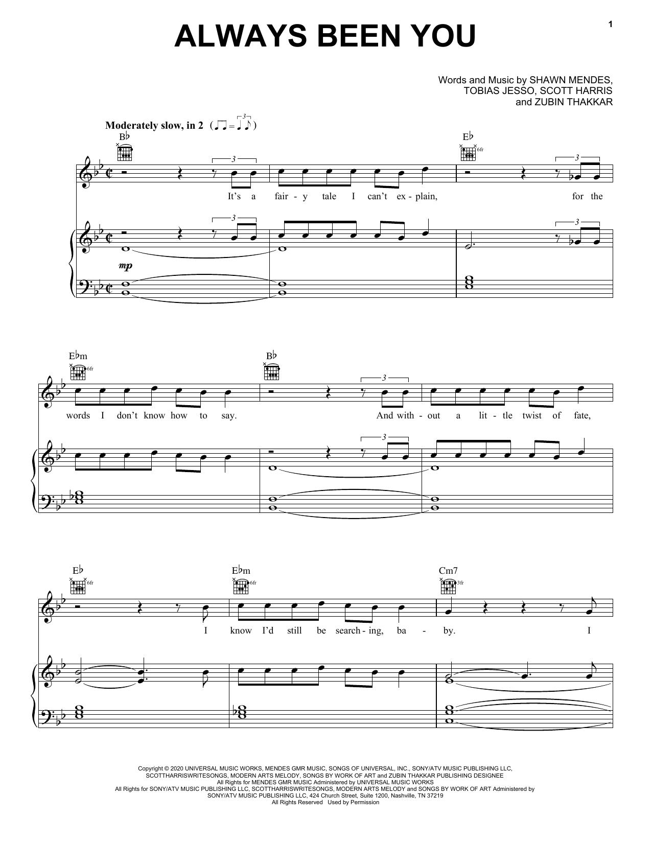 Download or print Shawn Mendes Always Been You sheet music, chords and digital score arranged for Piano, Vocal & Guitar Chords (Right-Hand Melody). This Pop score includes 6 page(s).