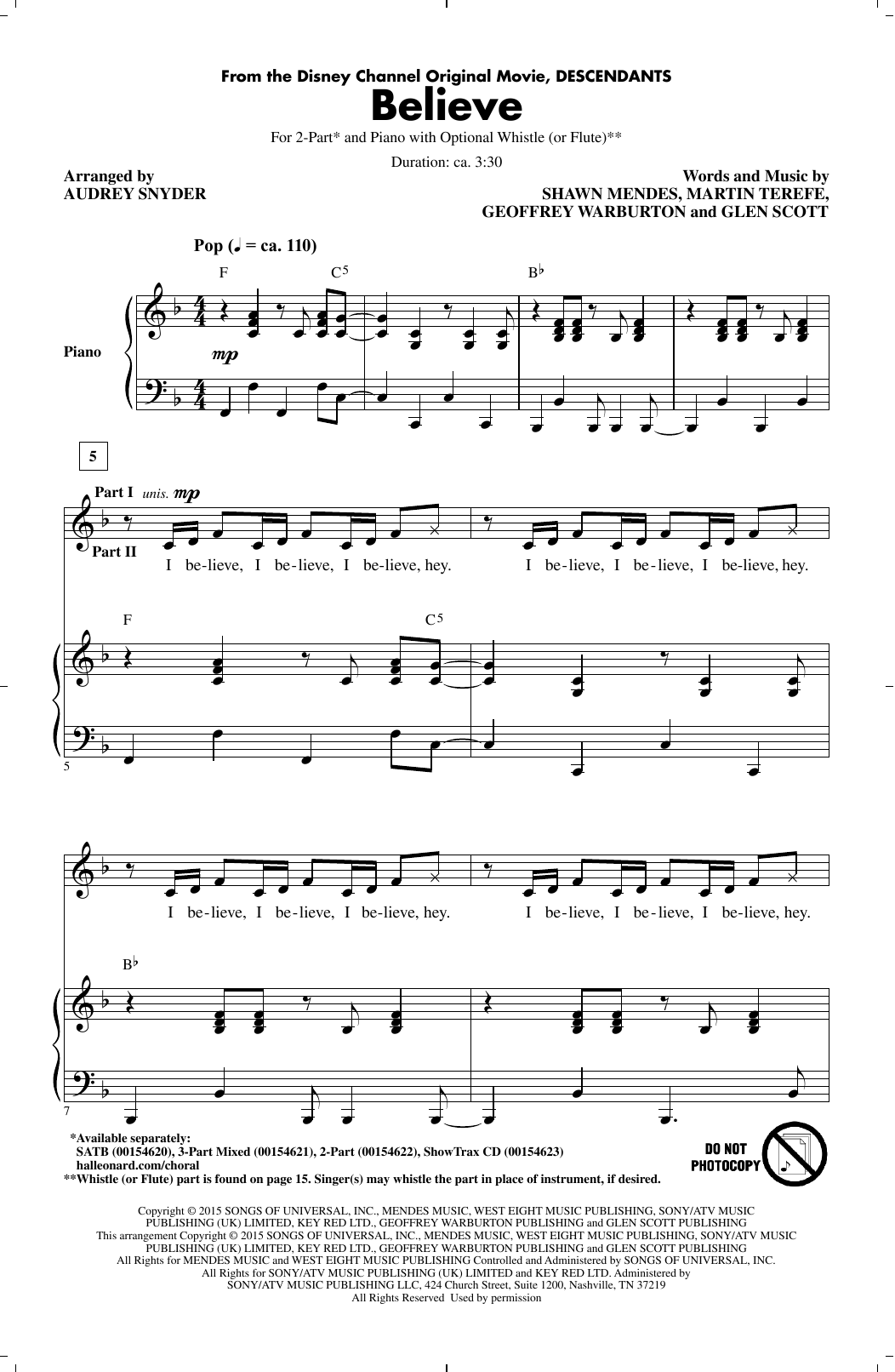 Download or print Shawn Mendes Believe (from Descendants) (arr. Audrey Snyder) sheet music, chords and digital score arranged for 3-Part Mixed Choir. This Children score includes 18 page(s).