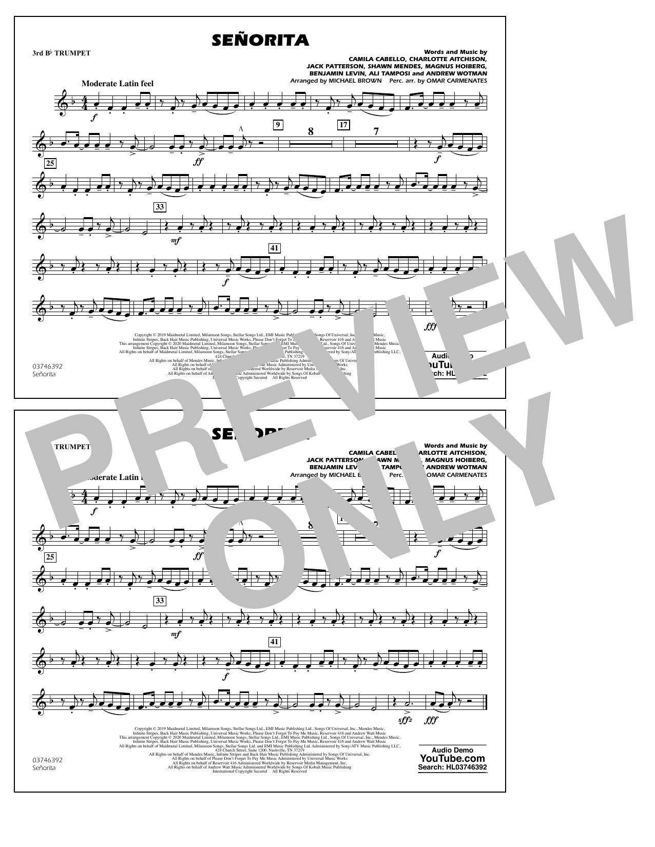 Download or print Shawn Mendes & Camila Cabello Señorita (arr. Carmenates and Brown) - 3rd Bb Trumpet sheet music, chords and digital score arranged for Marching Band. This Pop score includes 1 page(s).