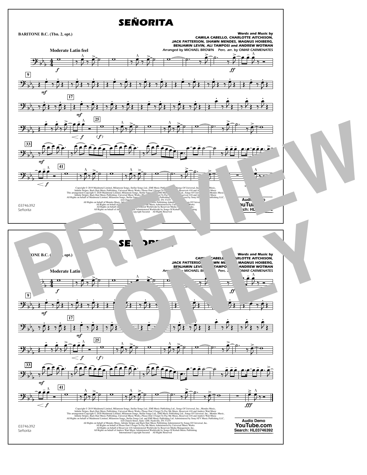 Download or print Shawn Mendes & Camila Cabello Señorita (arr. Carmenates and Brown) - Baritone B.C. sheet music, chords and digital score arranged for Marching Band. This Pop score includes 1 page(s).