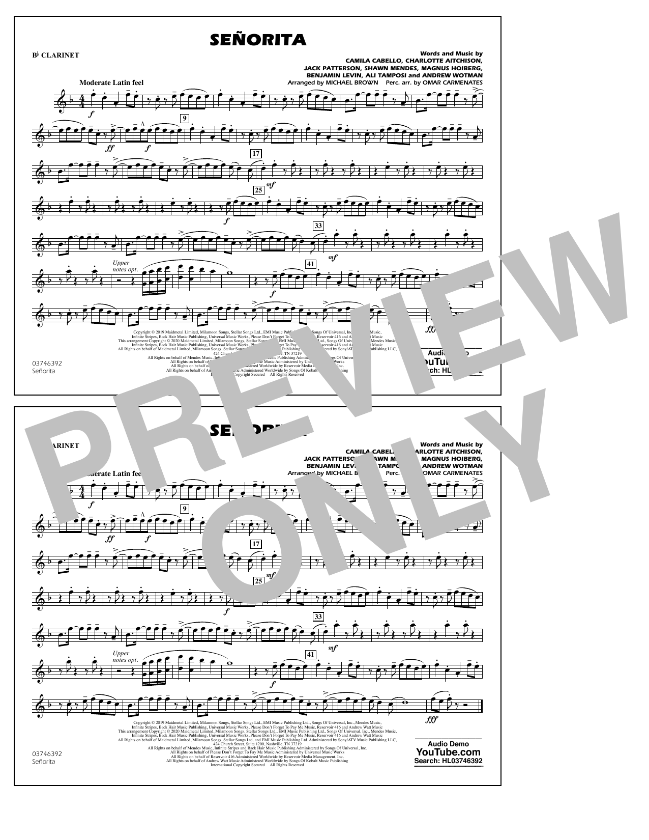 Download or print Shawn Mendes & Camila Cabello Señorita (arr. Carmenates and Brown) - Bb Clarinet sheet music, chords and digital score arranged for Marching Band. This Pop score includes 1 page(s).