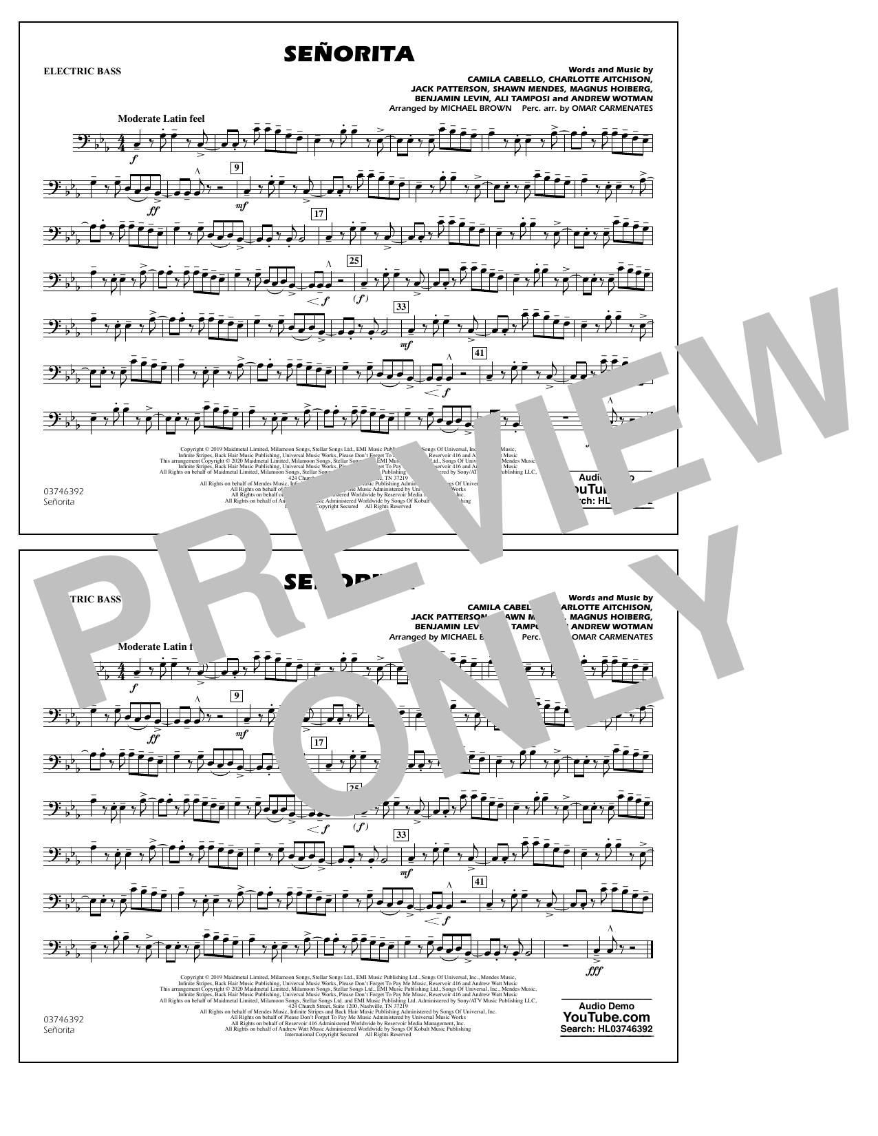 Download or print Shawn Mendes & Camila Cabello Señorita (arr. Carmenates and Brown) - Electric Bass sheet music, chords and digital score arranged for Marching Band. This Pop score includes 1 page(s).