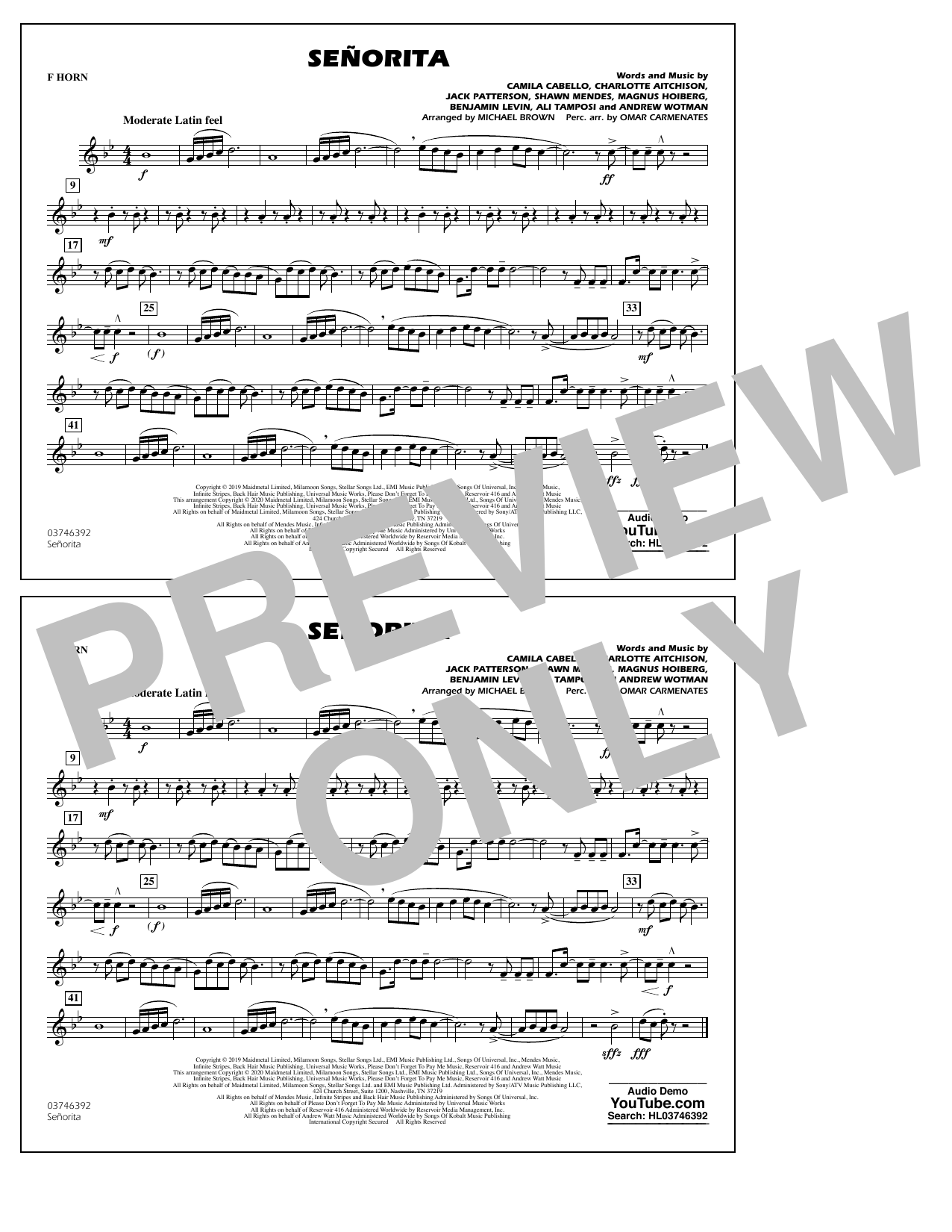 Download or print Shawn Mendes & Camila Cabello Señorita (arr. Carmenates and Brown) - F Horn sheet music, chords and digital score arranged for Marching Band. This Pop score includes 1 page(s).