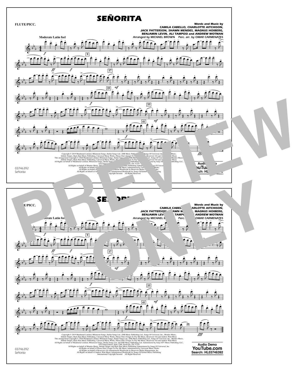 Download or print Shawn Mendes & Camila Cabello Señorita (arr. Carmenates and Brown) - Flute/Piccolo sheet music, chords and digital score arranged for Marching Band. This Pop score includes 1 page(s).
