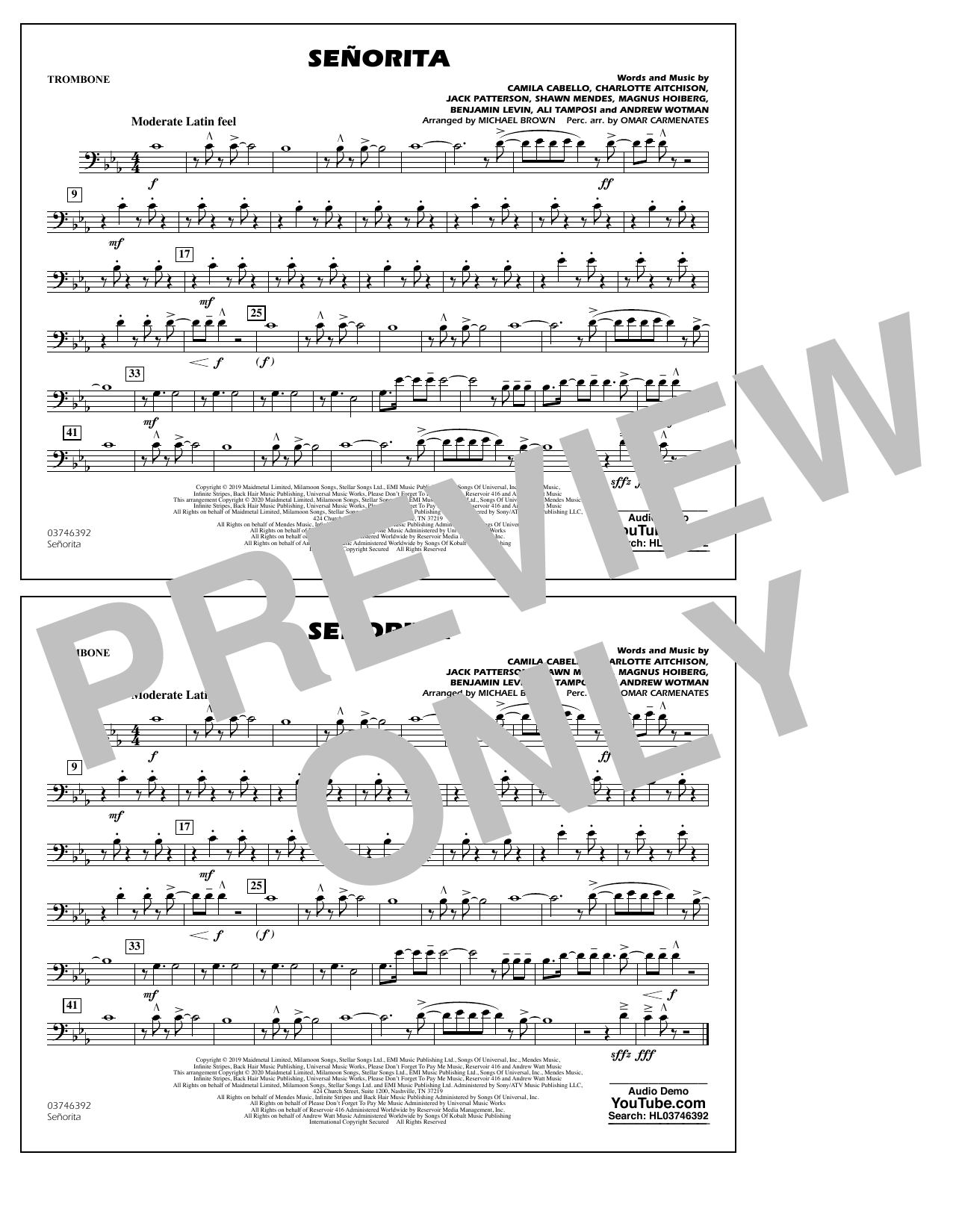 Download or print Shawn Mendes & Camila Cabello Señorita (arr. Carmenates and Brown) - Trombone sheet music, chords and digital score arranged for Marching Band. This Pop score includes 1 page(s).