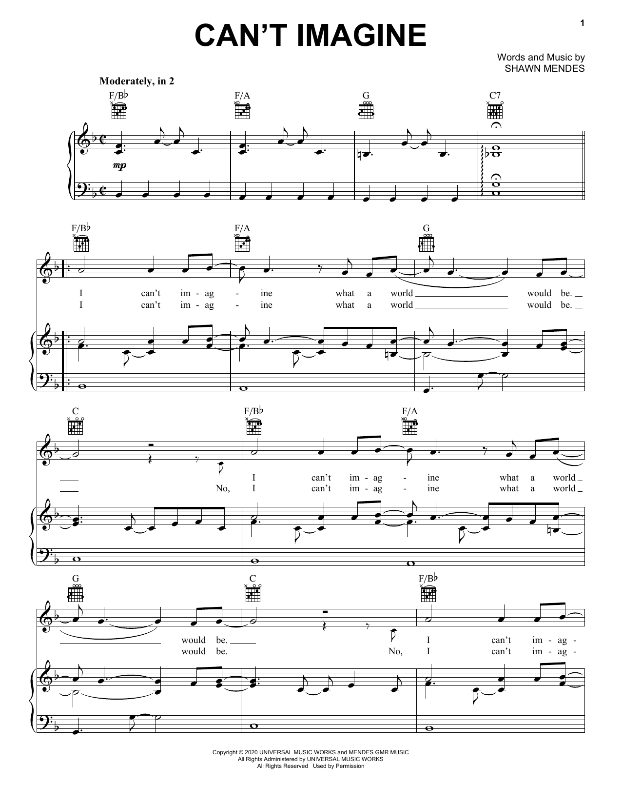 Download or print Shawn Mendes Can't Imagine sheet music, chords and digital score arranged for Piano, Vocal & Guitar Chords (Right-Hand Melody). This Pop score includes 5 page(s).