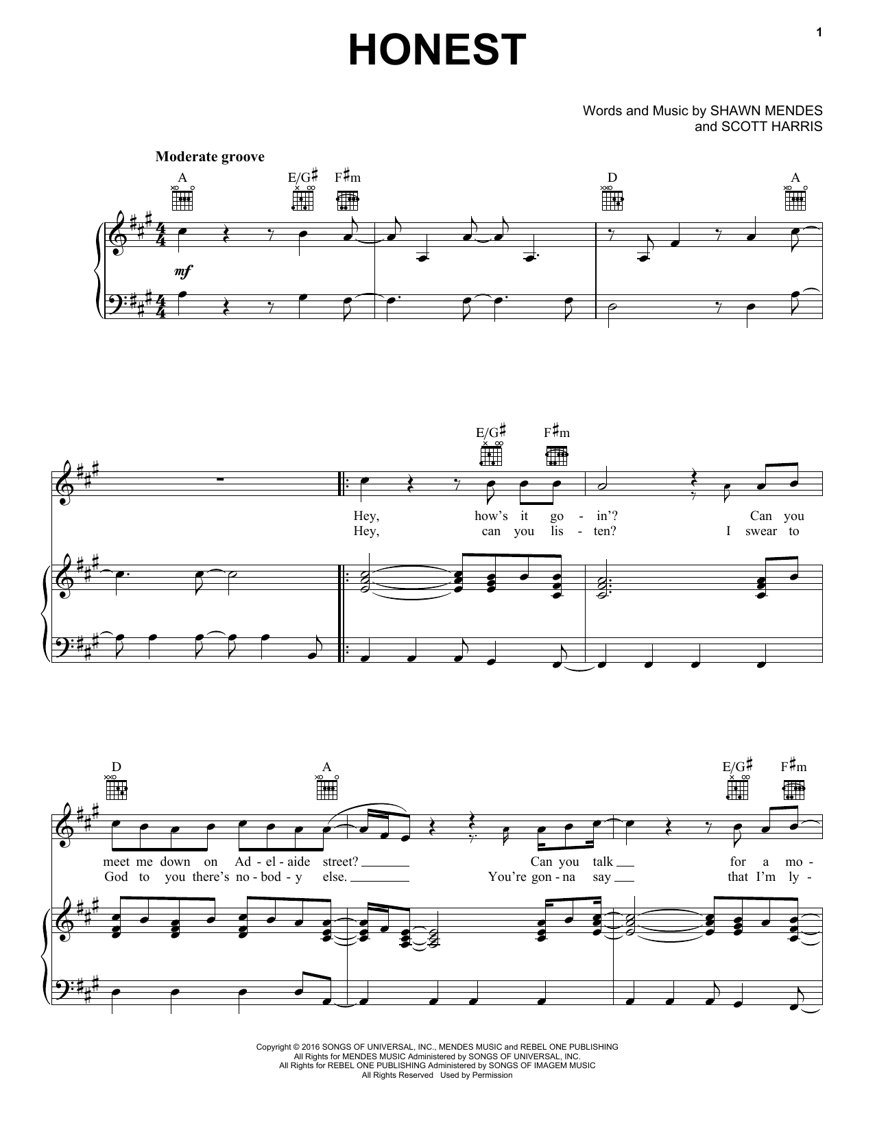 Download or print Shawn Mendes Honest sheet music, chords and digital score arranged for Piano, Vocal & Guitar Chords (Right-Hand Melody). This Pop score includes 5 page(s).