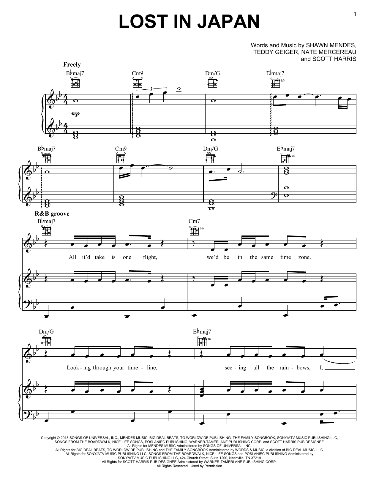 Download or print Shawn Mendes Lost In Japan sheet music, chords and digital score arranged for Piano, Vocal & Guitar Chords (Right-Hand Melody). This Pop score includes 7 page(s).