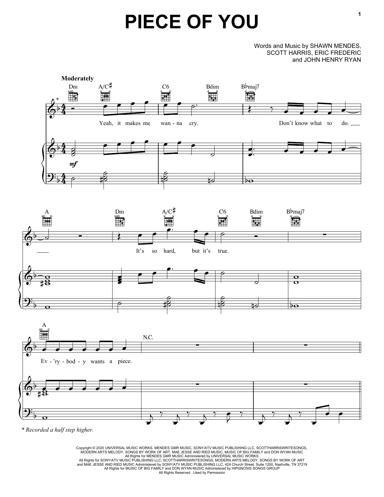 Download or print Shawn Mendes Piece Of You sheet music, chords and digital score arranged for Piano, Vocal & Guitar Chords (Right-Hand Melody). This Pop score includes 7 page(s).
